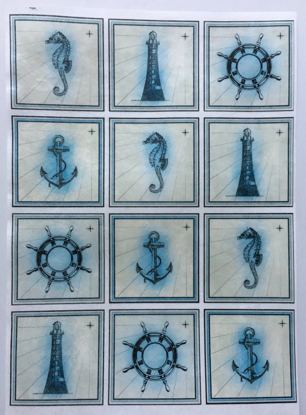 24 edible nautical tags--12 on each sheet as shown. Approximately 2.5" X 2.5" each. Two sheets total.